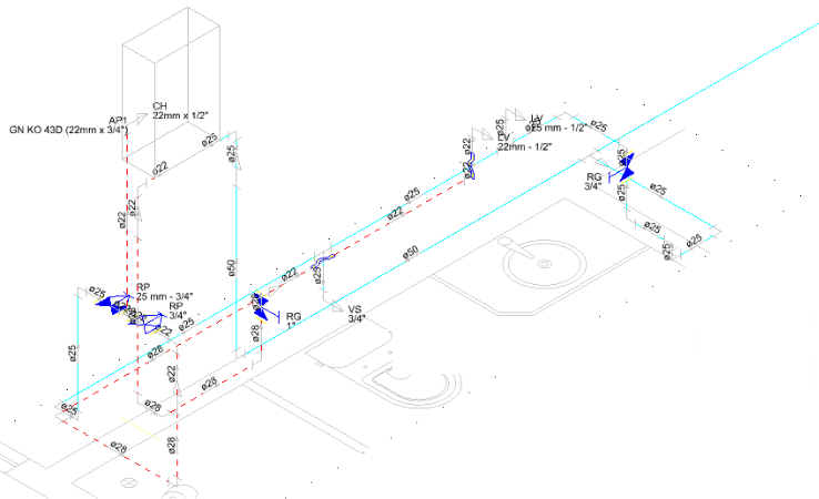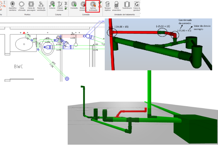 Para realmente atender a esse fluxo de compatibilização dos projetos, ficou claro que adotar o BIM no projeto de instalações era muito mais do que fazer representações bem detalhadas. No projeto de instalações sanitárias, que tradicionalmente sempre foi feito em 2D, a declividade da tubulação é fundamental, mas era apenas indicada no desenho e os elementos em 3D ficavam todos no mesmo plano. Com isso, erro em todas as verificações de colisão – a tubulação sanitária ficava inteira colidindo com as lajes ou com as vigas, totalmente diferente do que tinha que ser feito na obra.