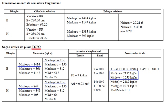Em primeiro lugar, com base no relatório visto acima, vê-se que a seção crítica do pilar está no topo da sua prumada. Neste caso somente os momentos Msdtopo e Madtopo são considerados na obtenção dos momentos finais de cálculo (Msd(x) e Msd(y)). Os momentos M2d e Mcd somente teriam influência se a seção crítica do pilar estivesse em seu centro.