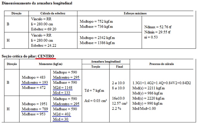 Com base no relatório visto acima, vê-se que a seção crítica do pilar está no centro da sua prumada. Neste caso, os momentos Msdcentro, Madcentro, M2d e Mcd são considerados na obtenção dos momentos finais de cálculo (Msd(x) e Msd(y)).