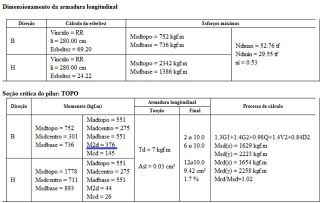 Analisando o relatório acima pode-se ver que os momentos acidentais (Mad) nas direções B e H do pilar são maiores que os momentos solicitantes (Msd). Isso ocorre devido ao considerável esforço de compressão atuando sobre ele (aproximadamente 240tf). Quanto maior for o valor de Nsd (esforço normal de cálculo) maior será o valor do momento acidental do pilar (Mad).