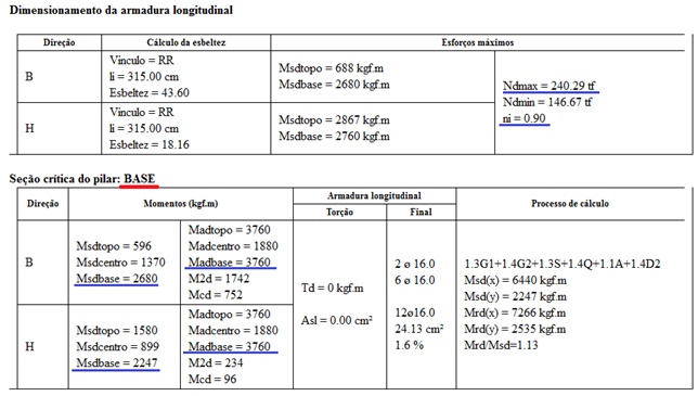 Com base no relatório visto acima, vê-se que a seção crítica do pilar está na base da sua prumada. Neste caso somente os momentos Msdbase e Madbase são considerados na obtenção dos momentos finais de cálculo (Msd(x) e Msd(y)). Os momentos M2d e Mcd somente teriam influência se a seção crítica do pilar estivesse em seu centro.