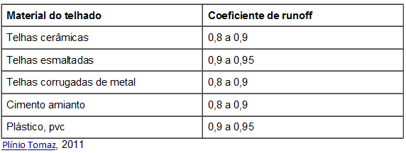 Não é possível que o aproveitamento de água da chuva seja total – ou 100%, pois parte da água que cai em uma determinada área evapora, passa pelo processo de autolimpeza ou sofre outras perdas. Por esse motivo, deve-se usar o coeficiente de runoff no cálculo de dimensionamento do volume que será efetivamente reservado. Para telhados este coeficiente pode ser de acordo com a tabela apresentada a seguir: